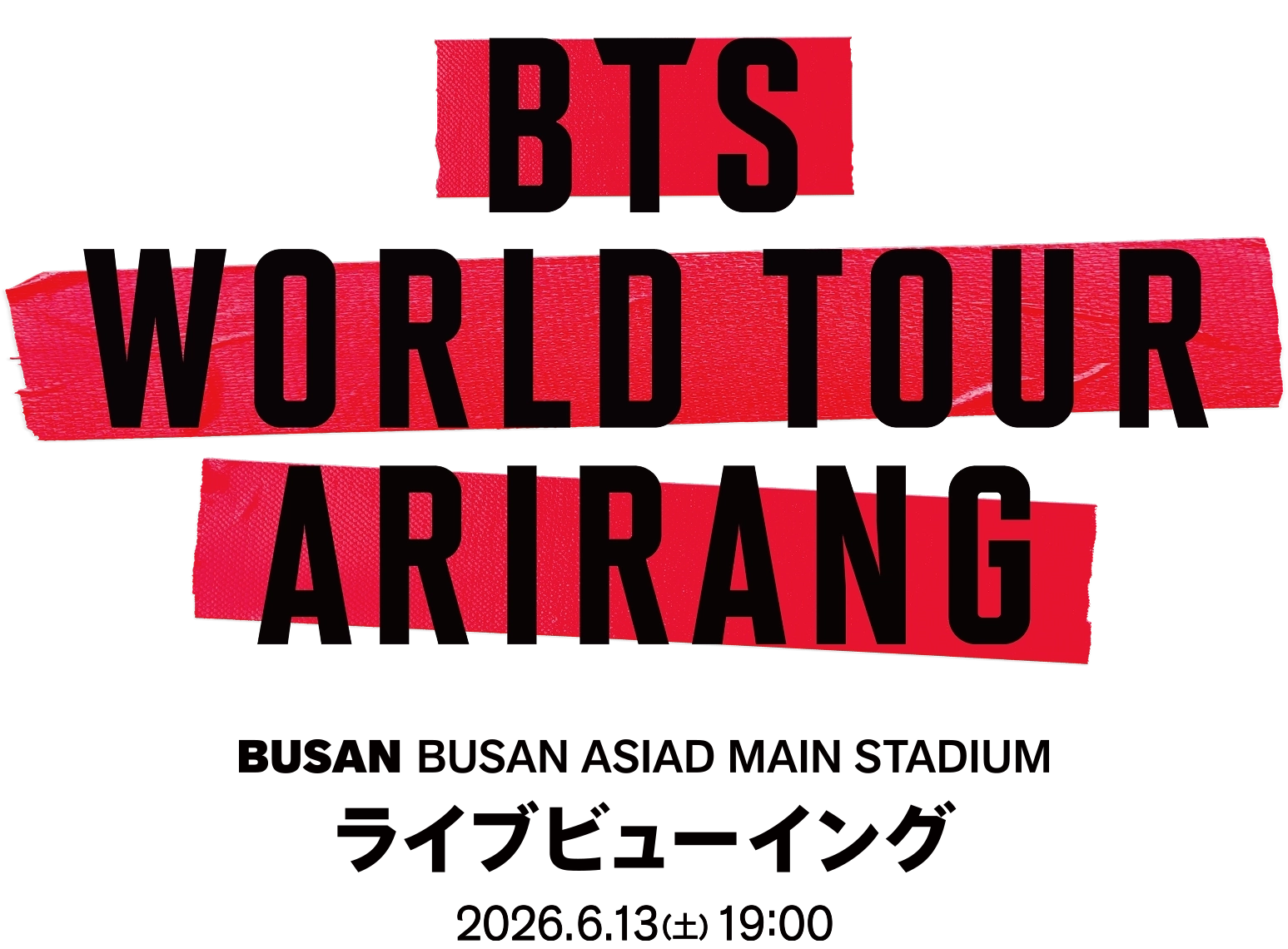 BTSが2026年から2027年にかけて開催する自身最大規模のワールドツアー『BTS WORLD TOUR 'ARIRANG'』より、6月13日(土)に韓国・釜山アジアド主競技場にて行われる公演のライブビューイング開催が決定いたしました!デビュー記念日となる釜山公演2日目の模様を日本全国の映画館にてリアルタイムでお楽しみいただけます。さらに、来場者特典として「フライトチケット風カード」も配布いたします! 映画館の大迫力のスクリーンで一緒にお楽しみください! ※本ページに記載の日時はすべて日本標準時(JST)になります。